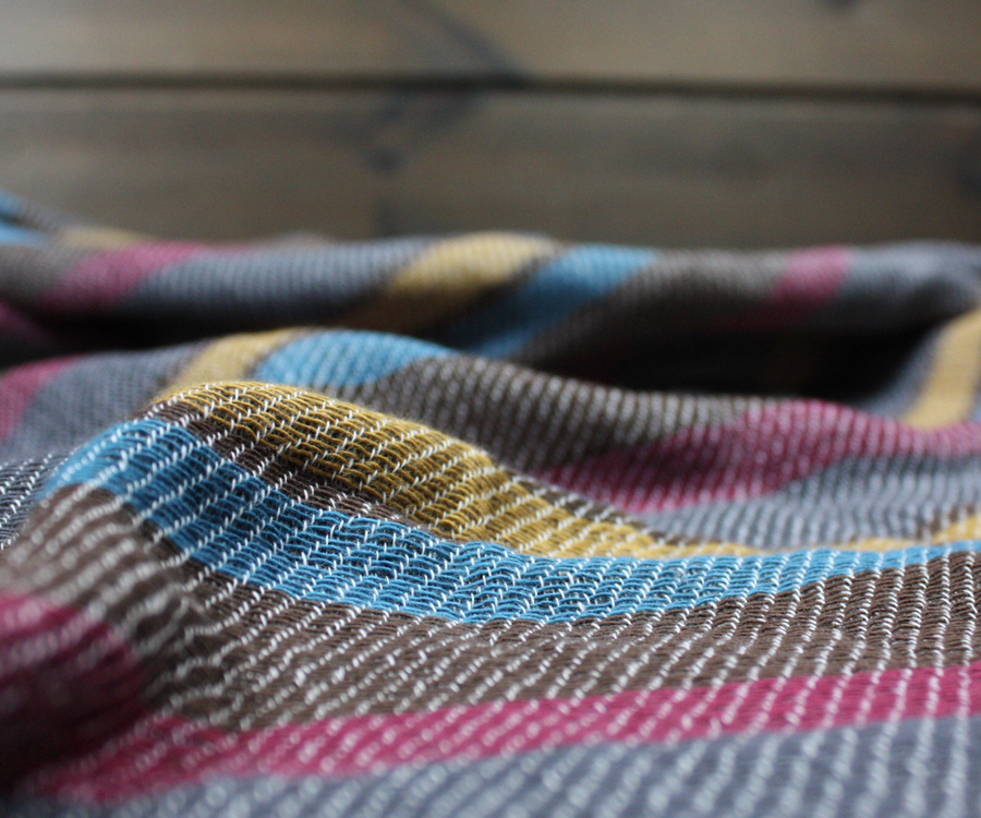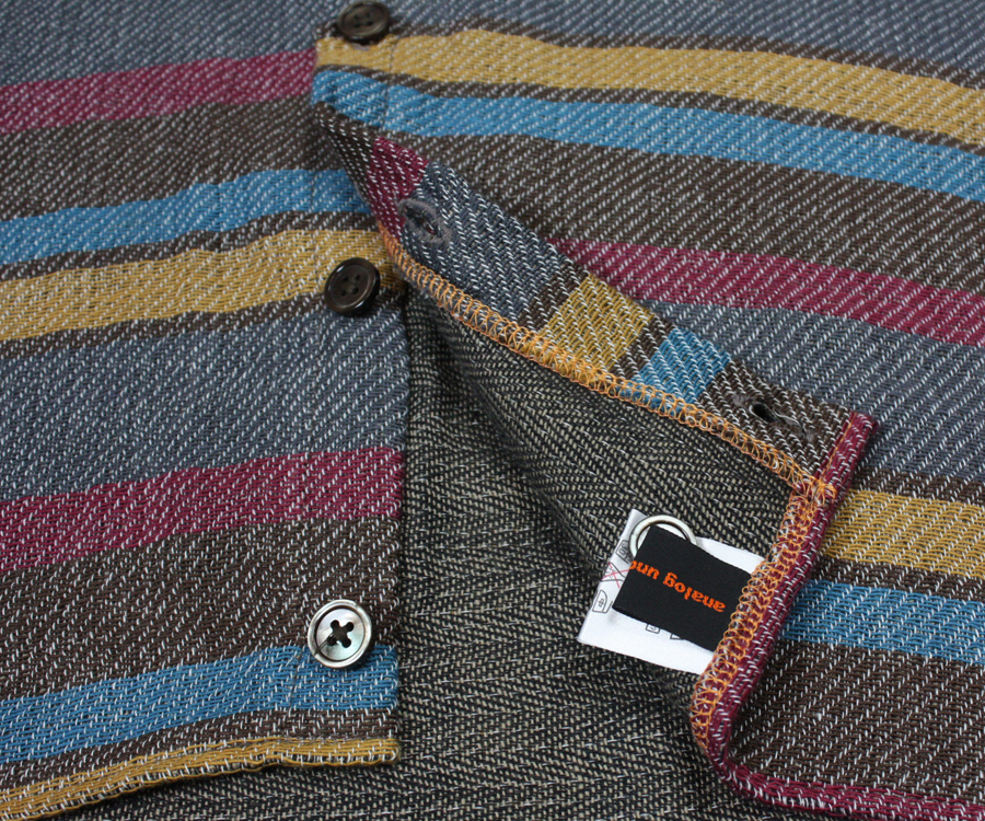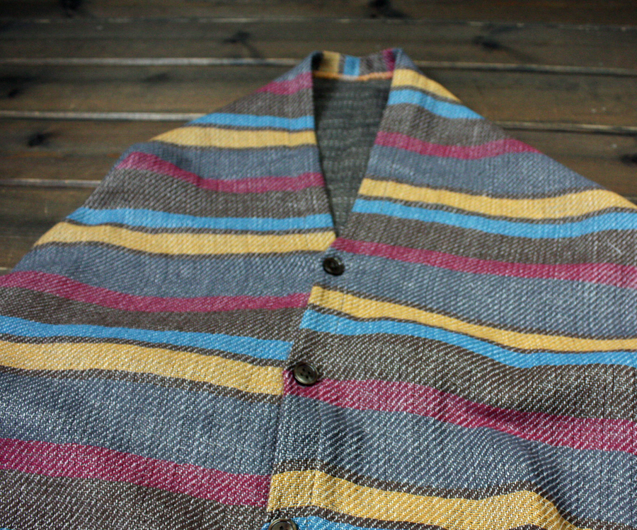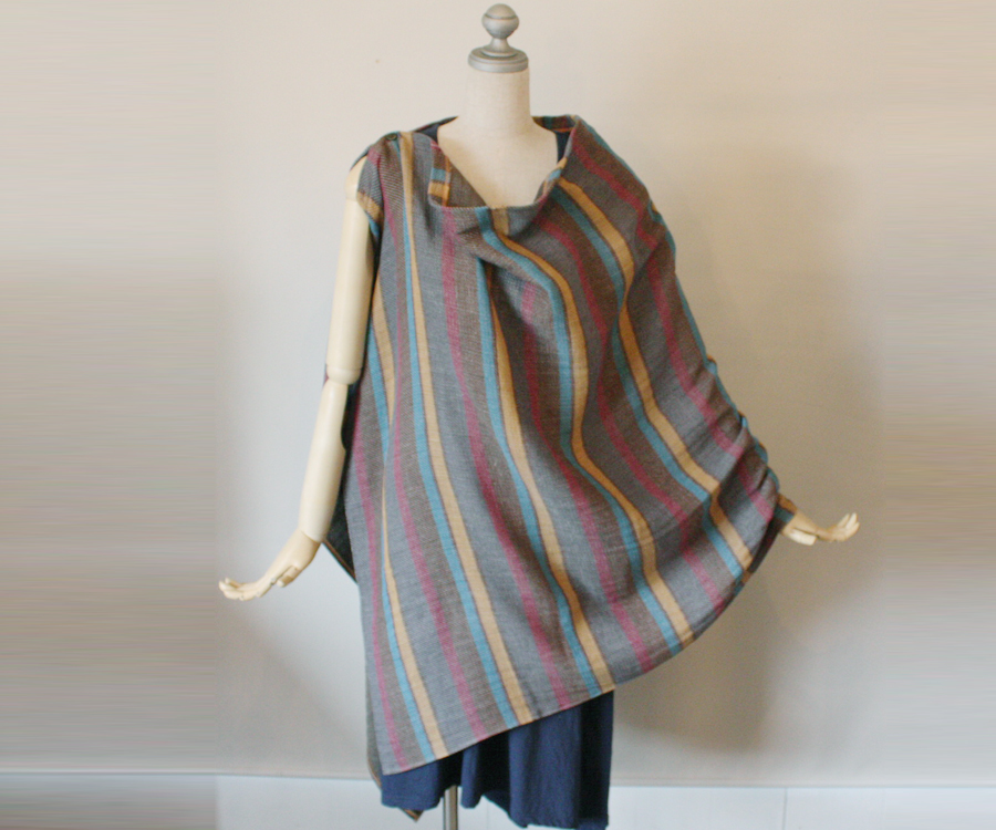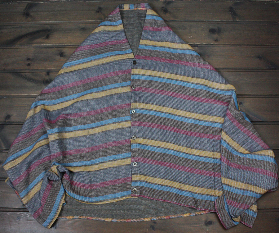 ヘリンボン調のヴィンテージストライプはデッドストックの生地を使用し国内での縫製。6つのボタンの留め位置で幅広い巻き方が楽しめ、ストールまたはポンチョとしてオールシーズンご利用いただけます。